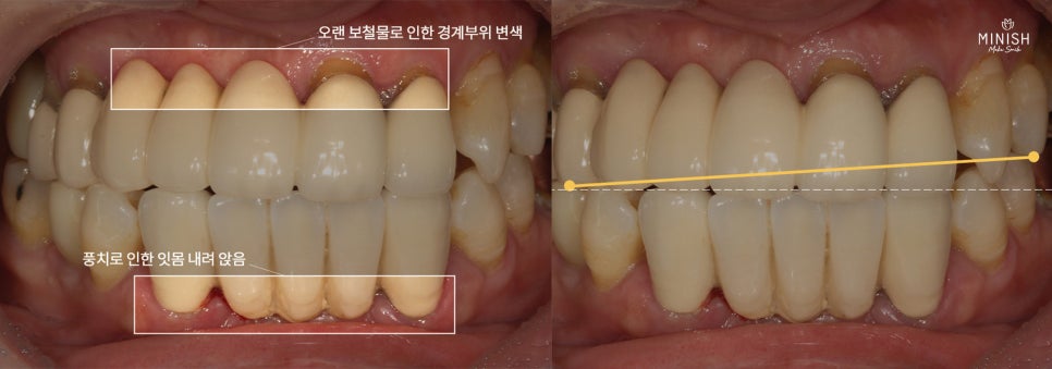 보철과 잇몸 사이에 퇴축이 생기면서 보철물과 치아 사이에 틈이 생기고, 그 부위가 어둡게 변색되며 금속이 비쳐 보였습니다. 이로 인해 음식물이나 세균이 침투할 수 있는 틈이 생기고 시간이 지날수록 청결 유지가 어려워지는 환경이 만들어졌습니다.