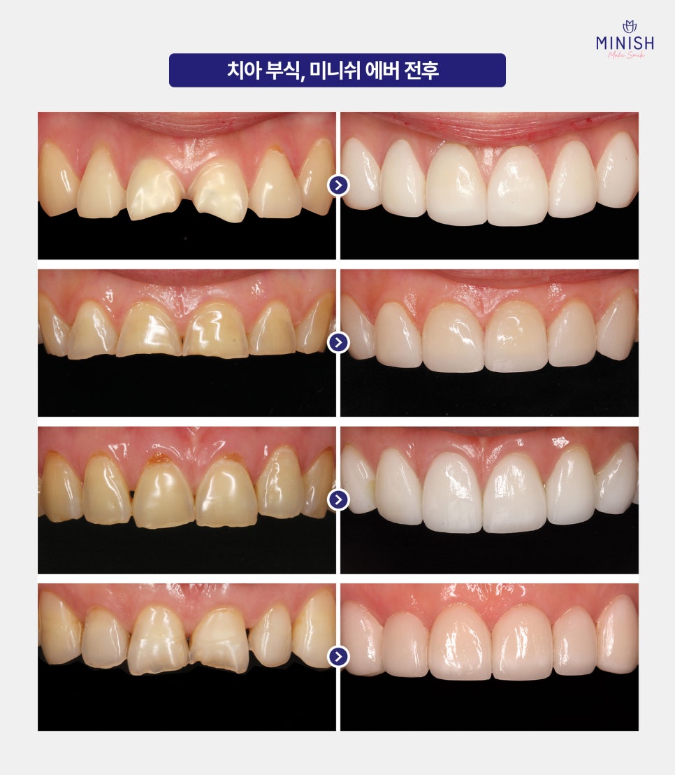 치아부식으로 약해졌던 치아가 미니쉬 에버를 통해 어떻게 복구되었는지 실제 사례를 통해 확인해보세요. 자연치아처럼 건강하고 조화로운 모습으로 회복된 모습을 직접 비교해보실 수 있습니다.