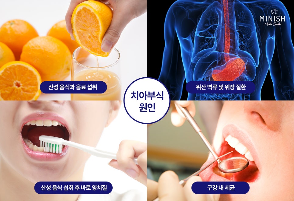 치아부식은 대표적으로 에나멜(법랑질)이 산성 물질에 반복적으로 노출되어 점차 손상되며 발생합니다. 특별한 상황이 아니더라도 우리가 일상적으로 접하는 음식이나 습관이 부식의 원인이 될 수 있습니다.