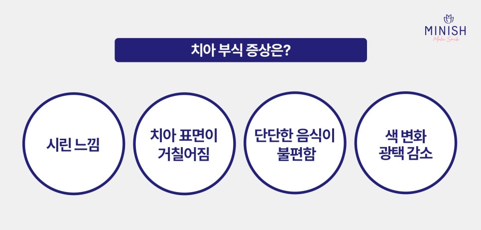 웃을 때 보이는 치아 그저 미소를 위한 요소일까요? 치아는 외적인 인상뿐 아니라 음식 섭취, 발음, 건강에 모두 영향을 주는 중요한 역할을 합니다.그런 치아가 거칠어졌거나, 시린 증상이 느껴진다면 치아부식을 의심해볼 수 있습니다. 치아부식은 생각보다 흔하고 초기엔 알아차리기 어려울 수 있지만 방치할 경우 점...