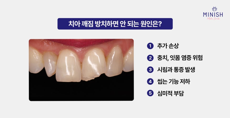 앞서 말씀드린 것처럼 치아깨짐은 단순히 겉모습의 문제가 아니라 제때 치료하지 않으면 더 큰 손상으로 이어질 수 있습니다. 치아를 삭제하지 않고 건강하게 복구하고 싶다면 지금 미니쉬치과병원으로 문의주세요!