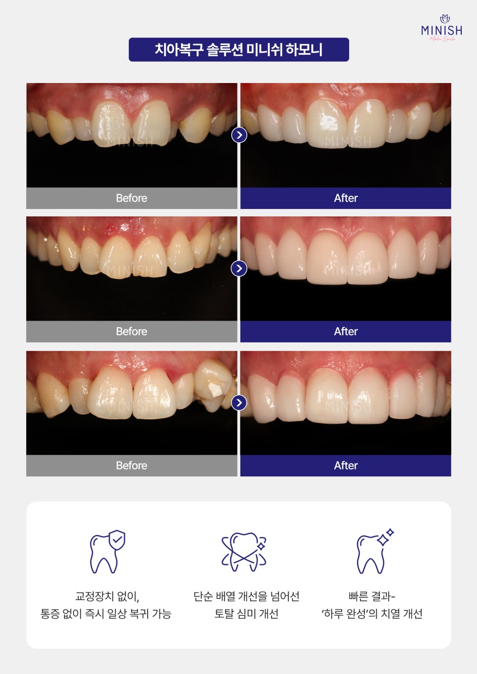 치아 이동 없이 상태에 맞춰 정밀하게 복구해, 하루 만에 건강한 기능과 정돈된 치열을 회복할 수 있는 방법이 바로 치아복구 솔루션 미니쉬 하모니입니다.