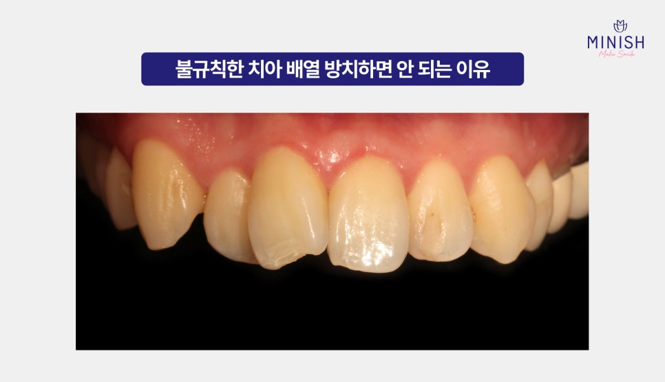 치아 사이가 고르지 않으면 칫솔이 잘 닿지 않아 음식물과 플라그가 남기 쉬우며, 이로 인해 세균이 번식하고 잇몸 염증이 유발될 수 있습니다.
