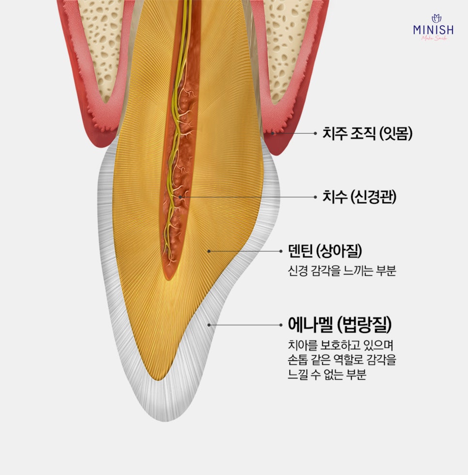 에나멜(법랑질)이 사라지면 덴틴(상아질)이 외부 자극을 바로 느껴 민감해집니다.