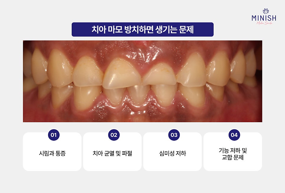 초기에는 간단한 관리로 충분하지만, 방치하면 치료 범위가 넓어지고 자연치아 보존이 어려워질 수 있습니다. 이미 치아가 많이 닳았다면, 크라운 대신 자연치아를 최대한 살리면서 앞뒤로 보호하는 듀얼 미니쉬를 고려해보세요. 빠른 진단과 맞춤 치료가 건강한 치아를 유지하는 첫걸음입니다.