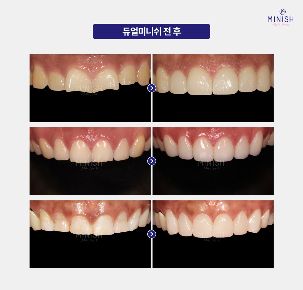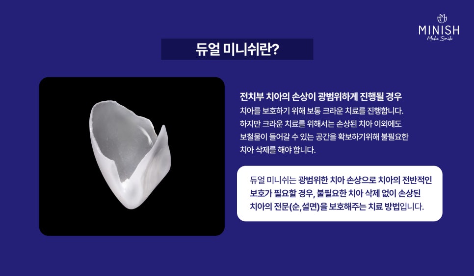 치아 안쪽(설측)까지 광범위하게 손상된 치아는 외부 자극에 더 쉽게 손상될 수 있기 때문에, 치아를 앞·뒤로 감싸 보호하는 방식이 필요합니다. 듀얼 미니쉬는 광범위한 치아 손상으로 치아의 전반적인 보호가 필요할 때, 불필요한 치아 삭제 없이 치아의 전면(순면·설면)을 모두 보호하는 방법입니다.
