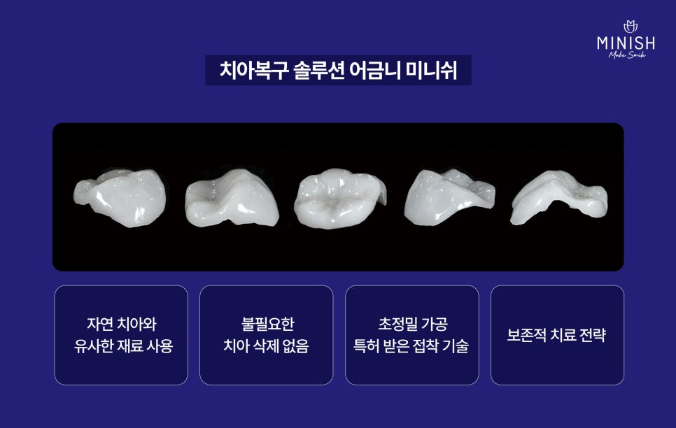 전통적 치료법이 손상 부위를 ‘보완’하는 데 그친다면, 어금니 미니쉬는 자연치아와 유사한 구조로 ‘복구’하는 치아복구 솔루션입니다. 특히 어금니처럼 씹는 힘이 큰 부위는 단순 보철이 아닌, 구조적 복원이 매우 중요합니다.