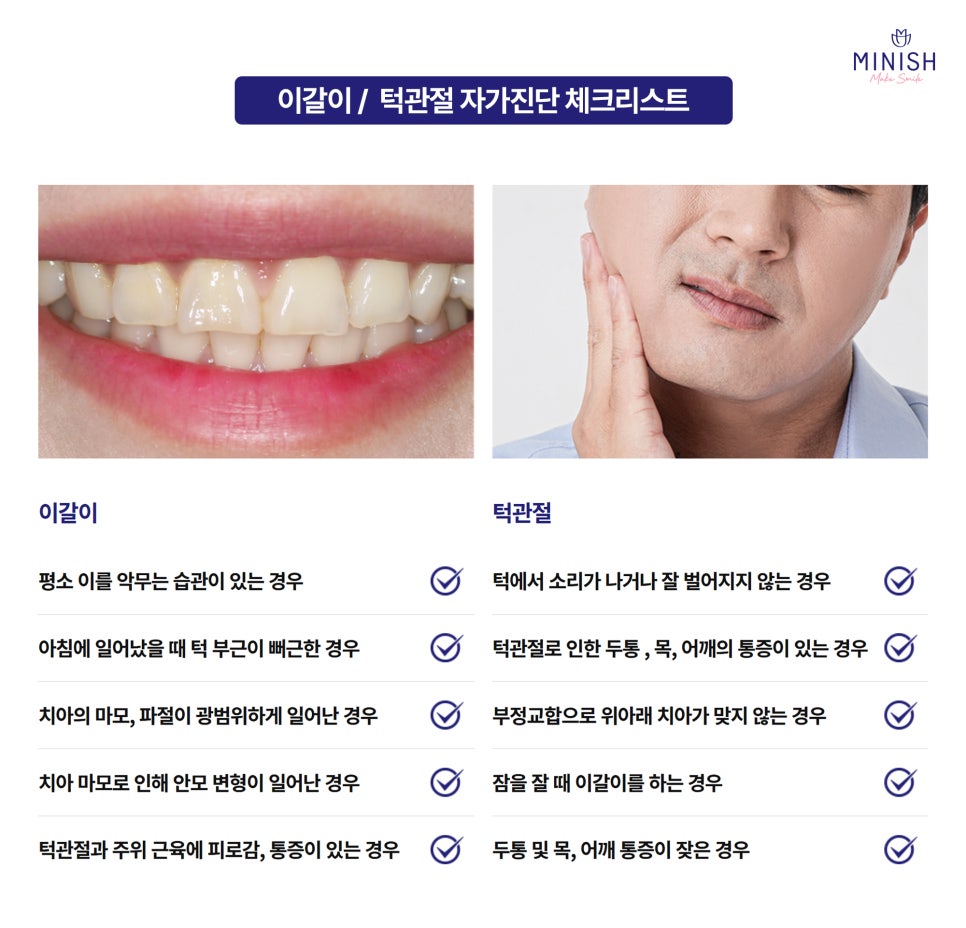 이갈이나 턱관절 문제는 방치할수록 만성화되기 쉽고, 치아와 턱에 동시에 큰 부담을 줄 수 있기 때문에 초기 진단과 치료가 무엇보다 중요합니다. 지금 바로 미니쉬치과병원에서 정확한 진단으로 치아 건강을 지켜보세요 😊
