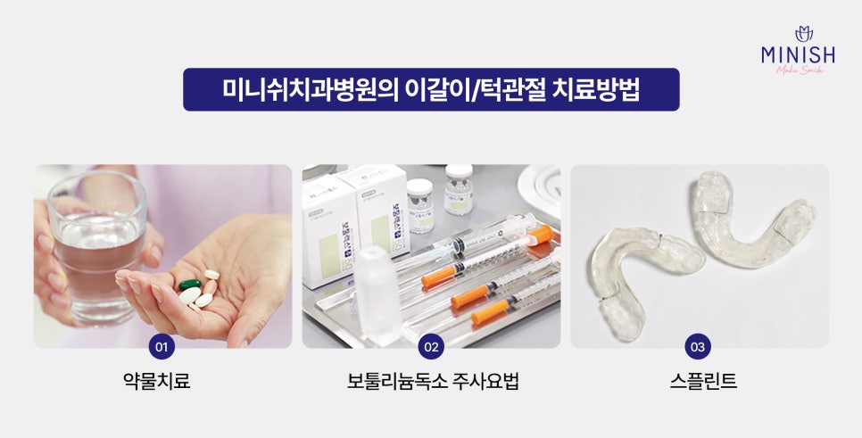 초기 통증이 있거나, 증상이 심하지 않은 경우에는 약물과 물리치료를 함께 진행합니다. 약물로는 염증을 줄이고 통증을 완화해 주는 약을 사용하고 물리치료로는 뭉친 근육을 풀어주어 턱 주변의 긴장을 완화합니다.