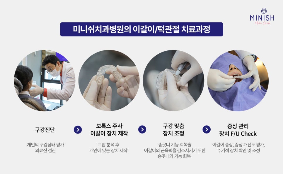 미니쉬치과병원에서는 정밀한 구강 진단을 통해 개인에게 적합한 치료 계획을 수립하고 기성품이 아닌 맞춤형 교합안정장치(스플린트)를 제작해드립니다. 또한 턱관절 및 이갈이 치료는 정확한 장치 조정과 정기적인 경과 관찰이 중요한 치료입니다. 증상 개선을 위해 전문 의료진의 세밀한 체크와 지속적인 관찰이 반드시 필요합니다.