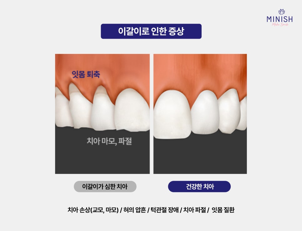 미니쉬는 단순히 손상된 치아를 복구하는 것을 넘어 자연스러운 치아 라인과 안모 균형까지 고려하기 때문에 이갈이로 달아버린 치아의 기능과 심미를 동시에 복구가 가능합니다.