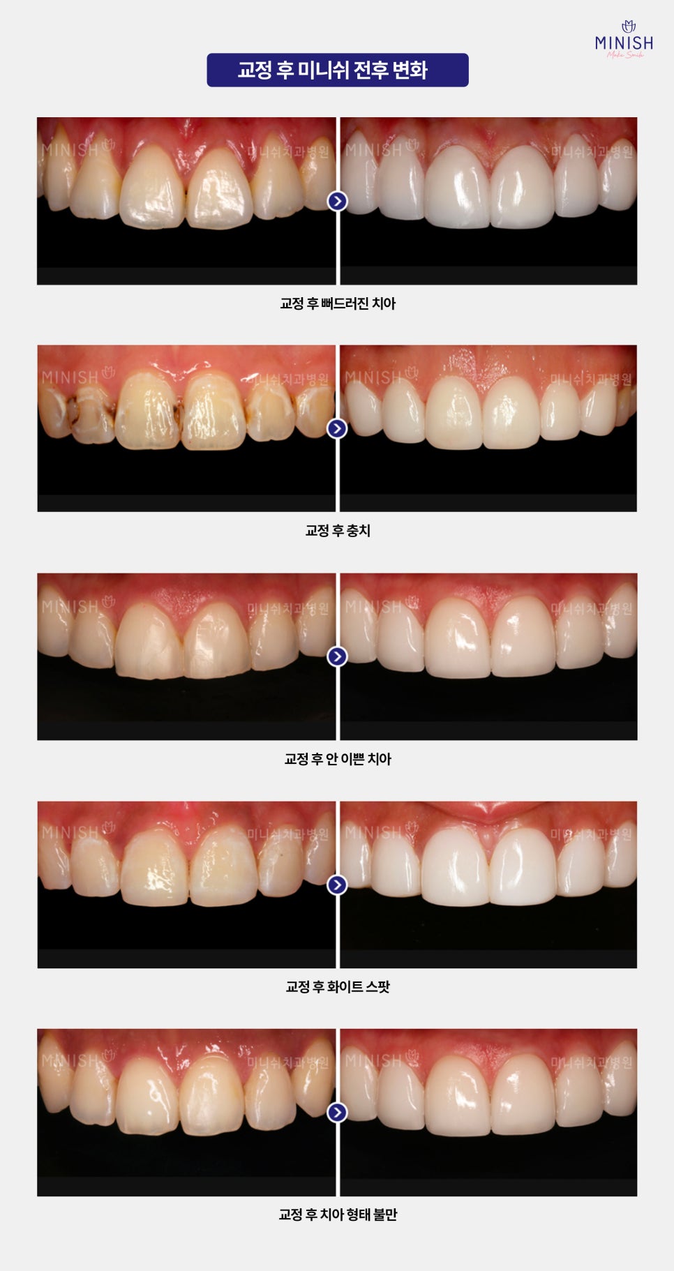 개개인의 치아 상태에 맞춰 기능은 물론 심미적인 부분까지 완벽하게 만족할 수 있습니다. 교정으로 배열을 바로잡고, 미니쉬로 치아의 형태와 색상, 질감까지 한층 더 개선하는 최적의 치아복구 솔루션을 경험해 보세요. 건강하고 아름다운 미소를 원하신다면, 지금 바로 미니쉬치과병원으로 방문하시길 권해드립니다.