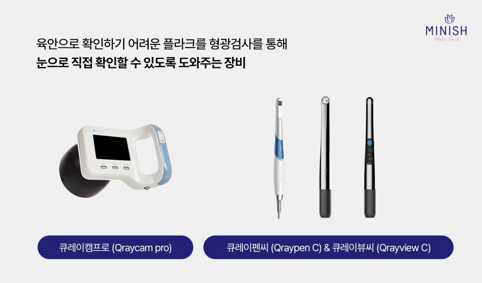 미니쉬 구강스파 프로그램에서는 육안으로 확인하기 어려운 플라크를 형광 검사를 통해 눈으로 직접 확인할 수 있도록 도와드립니다.