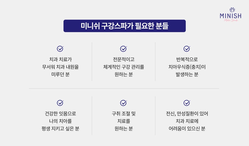 미니쉬 구강스파는 다음과 같은 분들께 적합합니다. 치과 치료가 어려우신 분, 체계적인 구강 관리가 필요한 분, 반복 충치나 구취 문제로 고민하시는 분, 치아를 오래 건강하게 유지하고 싶으신 분, 올바른 구강 관리 방법이 궁금하신 분 등 개인 맞춤형 프로그램으로 평생 건강한 구강을 지켜드립니다.