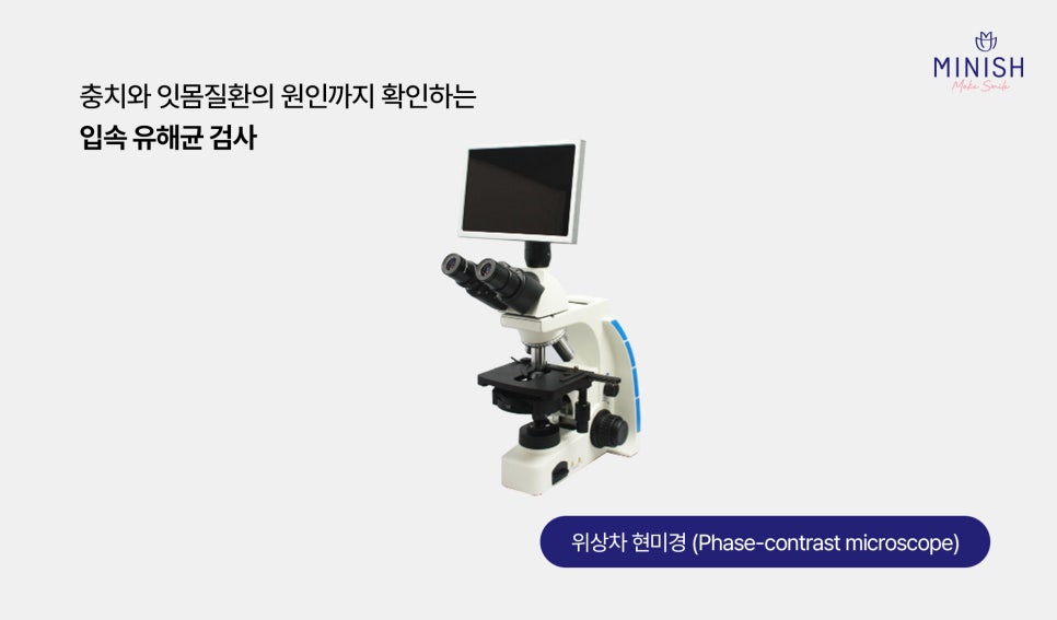 위상차 현미경은 충치와 풍치(잇몸질환)의 원인이 되는 입속 세균의 구성과 활성도를 실시간으로 관찰할 수 있는 장비입니다.