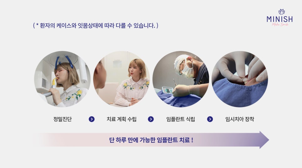 빠르고 정확한 원데이 임플란트는 구강 상태에 따라 발치와 뼈이식, 임플란트 식립을 동시에 진행하여 환자의 내원 횟수를 줄이고 부담을 덜어주는 혁신적인 치료법입니다. 앞니 임플란트나 초기 고정이 충분한 경우, 수술 당일 임시 보철물을 장착해 즉시 심미적 기능 회복이 가능합니다. 미니쉬치과병원에서는 최첨단 3D CT 촬영과 디지털 가이드 시스템으로 정확한 위치에 식립하며, 무절개 또는 최소 절개 방식으로 출혈과 통증을 최소화합니다. 이렇게 하루 만에 수술과 임시치아 장착이 완료되어 빠른 일상 복귀가 가능해 바쁜 분들께 적합합니다.