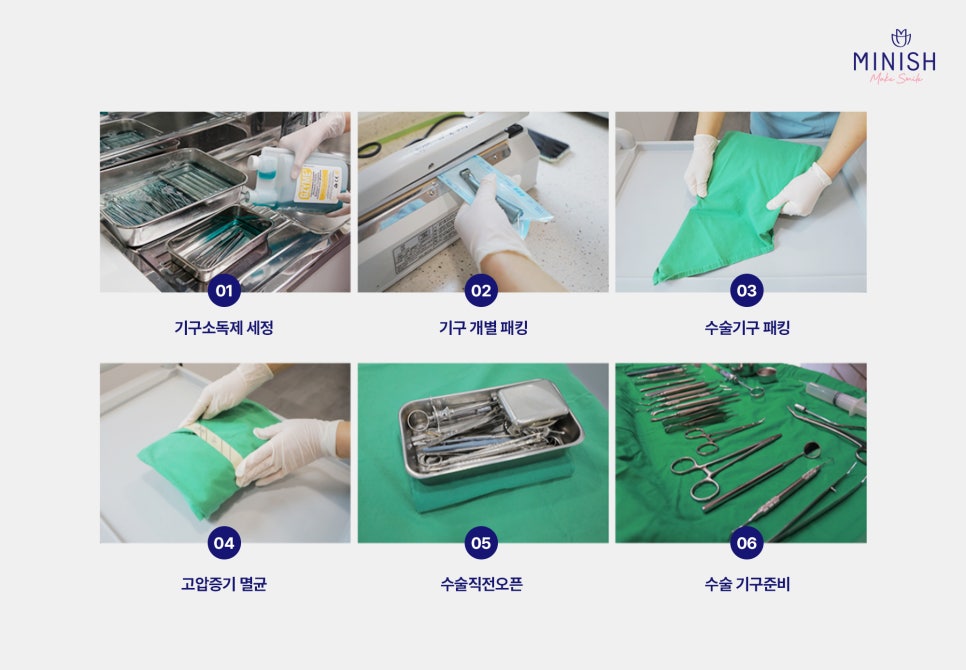 미니쉬치과병원은 국제규격에 부합하는 엄격한 멸균 및 소독 시스템을 적용하여 임플란트 수술 시 발생할 수 있는 교차감염을 철저히 예방합니다. 수술에 사용되는 모든 기구와 의료 용품은 국가 및 국제 표준에 따른 멸균 처리를 거쳐 무균 상태로 관리되며, 의료진은 외과적 손 소독과 멸균 장갑 착용 등 무균기술을 철저히 준수합니다.