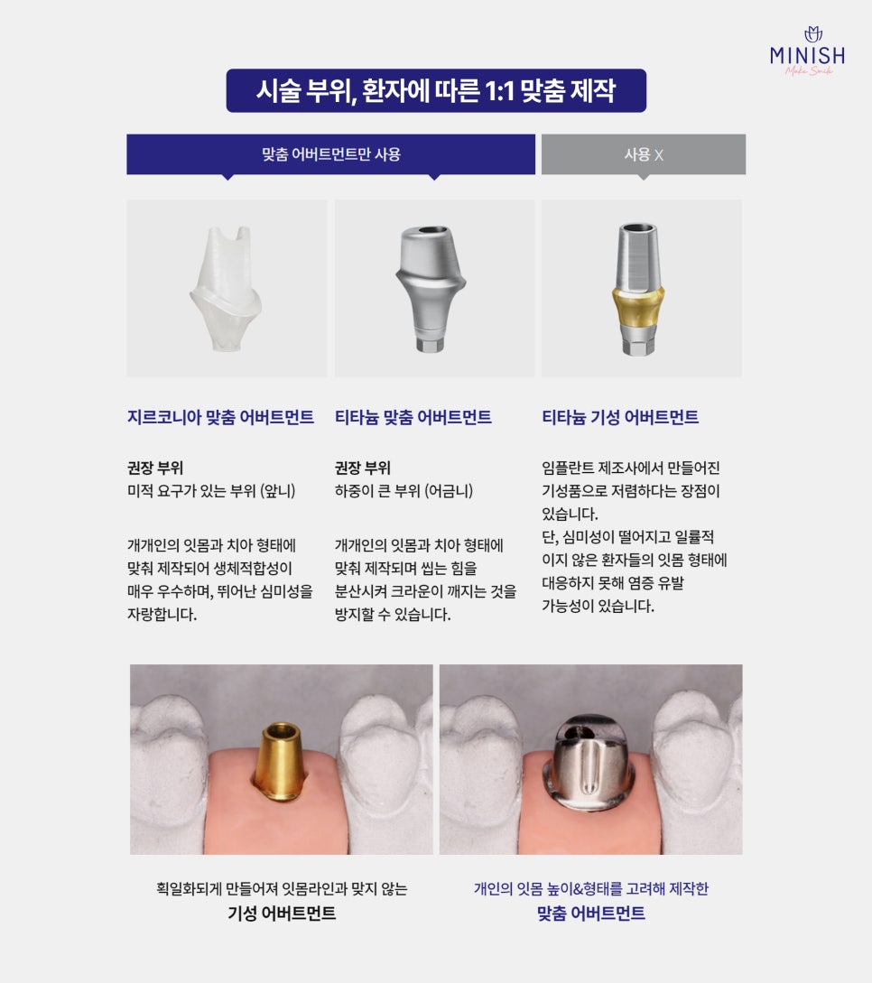 미니쉬치과병원은 자체 기공연구소를 통해, 시술 부위와 환자의 구강 구조에 딱 맞는 맞춤형 임플란트 어버트먼트를 실시간으로 제작하고 있습니다. 환자의 잇몸 라인과 치아 형태를 반영하여 1:1 맞춤으로 설계되기 때문에, 음식물이 끼는 현상을 예방하고 임플란트 염증 발생 위험을 크게 낮추는 등 풍치 예방에도 탁월합니다. 이는 단순 기성품이 아닌, 개개인만을 위한 보철물을 바로 제작·수정할 수 있어 더욱 안전하고 만족도 높은 치료 결과를 제공합니다.