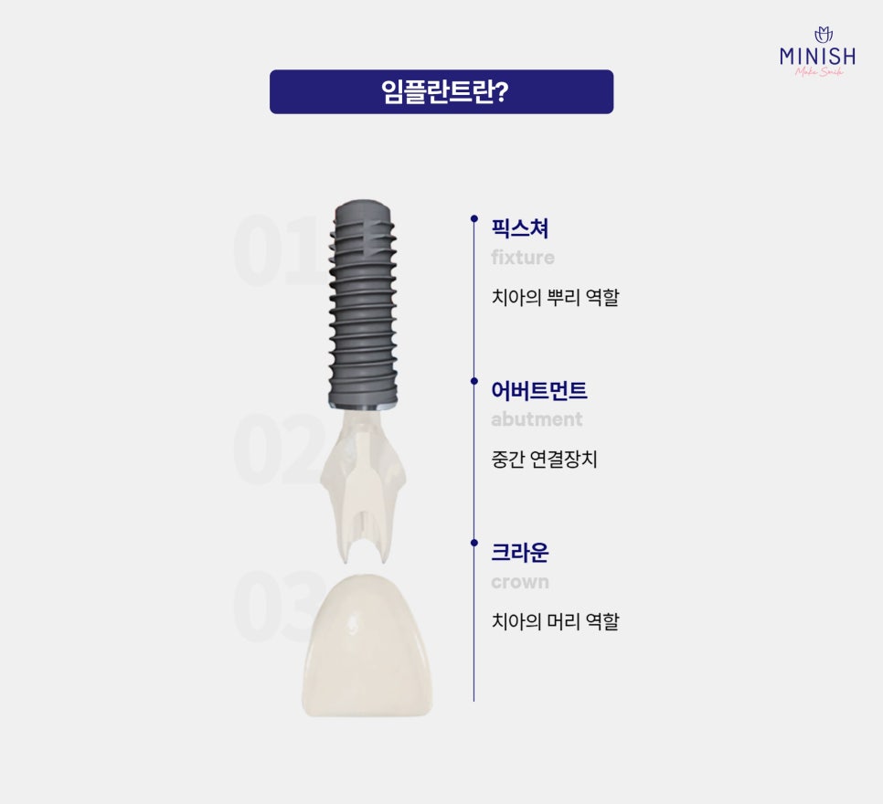 이 중 어느 하나라도 부족하면 임플란트 시술은 제대로 이루어질 수 없습니다. 미니쉬치과병원은 이 모든 구성 요소에 정성을 다합니다. 정확한 위치에 식립되는 인공치근, 환자 구강 상태에 맞춘 맞춤형 지대주, 그리고 자연치아와 구분되지 않는 보철물까지 모든 과정에서 세심하게 진료하여 환자가 원래 치아처럼 편안하게 사용할 수 있도록 최선을 다합니다.
