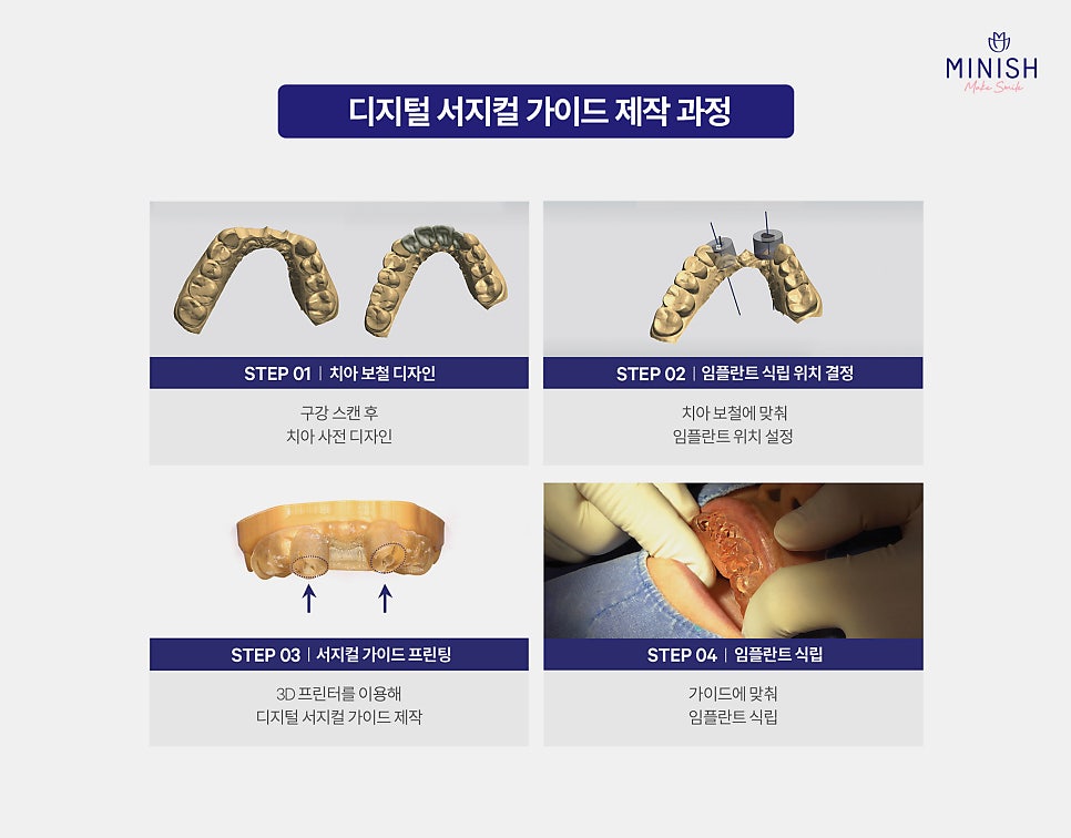 첨단 구강 스캐너와 3D 프린터를 이용해 나만의 맞춤형 임플란트 식립 가이드를 제작합니다. 실제 수술 전, 컴퓨터상에서 정밀하게 위치와 각도를 시뮬레이션하여 위험 요소를 최소화하고 예측 가능한 결과를 만듭니다. 디지털 서지컬 가이드는 환자 개개인의 구강 구조에 꼭 맞게 만들어져, 수술 시 오차를 줄이고 회복 속도까지 향상시킵니다. 또한 불필요한 절개가 줄어들어 출혈이 적고 통증 부담도 최소화할 수 있습니다. 이처럼 미니쉬치과병원에서는 아날로그 방식이 아닌 최첨단 디지털 시스템을 적용해 더욱 안전하고 체계적인 임플란트 치료를 제공합니다.