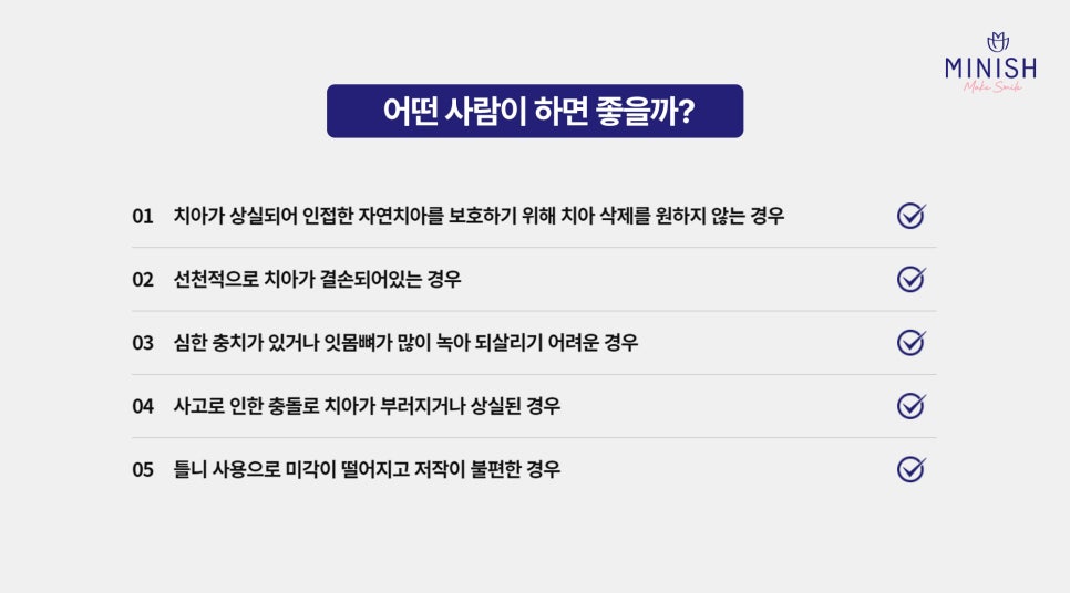치아 상실 후 어떤 치료가 본인에게 가장 적합한지 고민되고 계신다면, 미니쉬치과병원에서 정확한 진단과 상담을 받아보시기 바랍니다. 건강한 치아 회복, 미니쉬가 함께하겠습니다.