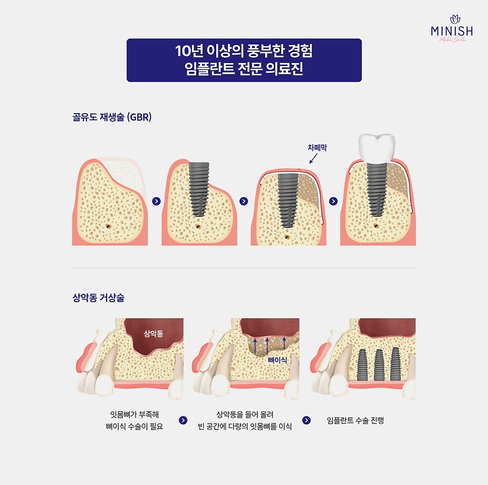 미니쉬치과병원은 10년 이상의 풍부한 경험을 지닌 임플란트 전문 의료진이 상주하여, 잇몸뼈가 부족한 환자도 안전하게 치료받을 수 있습니다. 고난도 뼈이식 및 골유도 재생술(GBR)을 통해 부족한 뼈를 효과적으로 재생하여 튼튼한 임플란트 식립을 도와드립니다.