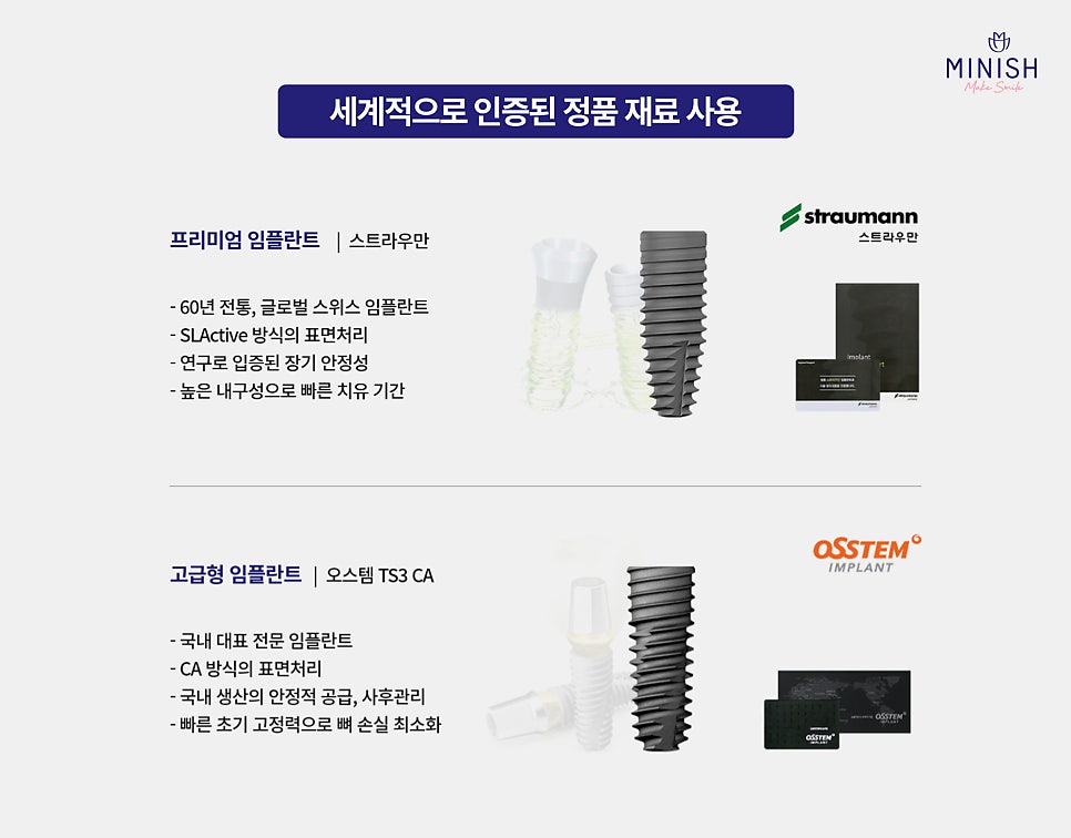 인공치근은 자연치아의 뿌리 역할을 하는 만큼 안정성과 내구성이 매우 중요합니다. 미니쉬치과병원에서는 각 제조사로부터 정품 인증을 받은 글로벌 임플란트 브랜드의 재료만을 사용하여 환자의 안전을 최우선으로 합니다. 세계적으로 임상적 안정성이 검증된 제품만을 엄선하여 정품 인증서와 함께 제공하므로 더욱 신뢰할 수 있는 임플란트 치료가 가능합니다.