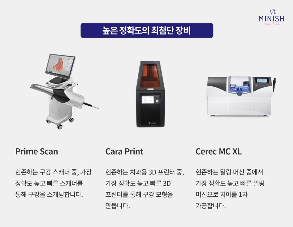 미니쉬 기공연구소의 최첨단 장비와 시스템이 결합되어 정밀한 수복물 제작이 가능해졌습니다. 이로 인해 환자가 치료를 받는 시간은 크게 단축됩니다. 또한 미니쉬를 동시에 최대 8개까지 제작할 수 있어 제작 시간이 1/8로 줄어듭니다. 구강 스캔을 통해 모든 치아를 디지털 정보로 전환하고, 이를 원내 기공연구소로 전송하여 본뜨는 과정에서 발생할 수 있는 재료 변형에 의한 오차를 최소화했습니다.