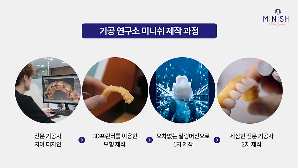 미니쉬는 기공소를 내부에 두어 의료진과 치아 디자이너 간 원활한 협업이 가능합니다. 치아 적용 후 환자별 요청이나 추가 보완이 필요한 부분도 원내에서 즉시 처리할 수 있어, 빠르고 정확한 맞춤형 제작이 진행됩니다.