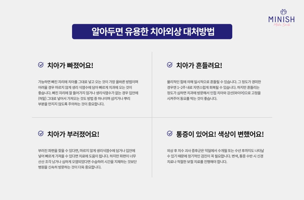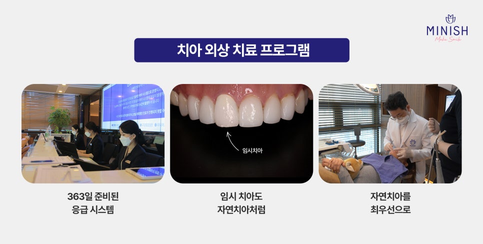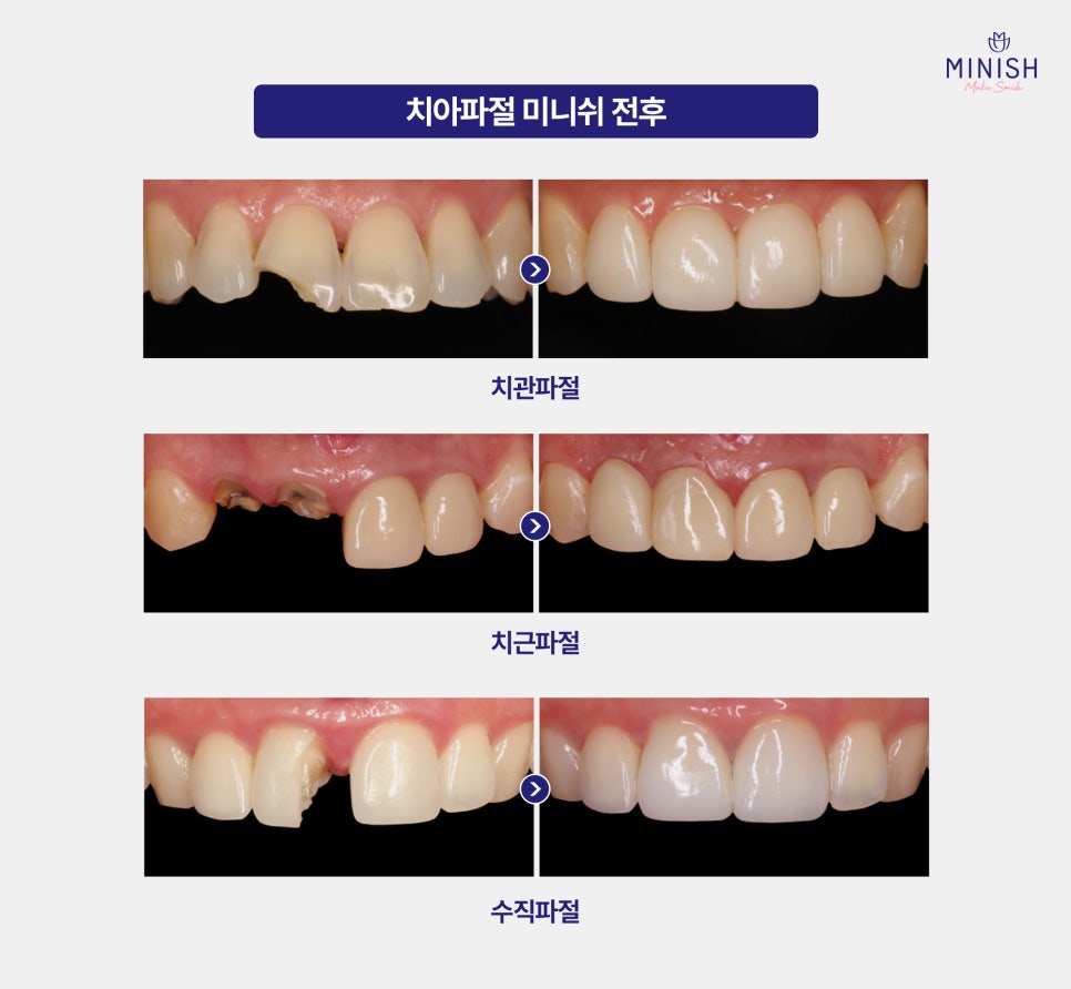 갑작스러운 치아 깨짐은 누구에게나 당황스러운 순간이지만 빠르고 정확한 대응이 건강한 치아를 지키는 열쇠입니다. 미니쉬치과병원의 전문 외상 프로그램과 치아복구 솔루션 미니쉬로 자연치아를 최대한 보존하며 본래 기능과 아름다움을 복구하시길 바라겠습니다.