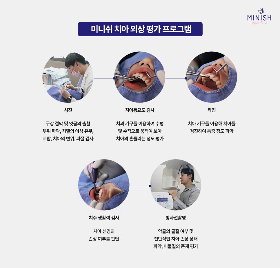 갑작스러운 치아 외상은 빠른 대처가 치료의 핵심입니다. 정확한 진단과 함께 치아복구 솔루션 미니쉬가 가능한 미니쉬치과병원에서 신속하고 체계적인 외상 치료를 받아보시길 권장드립니다.