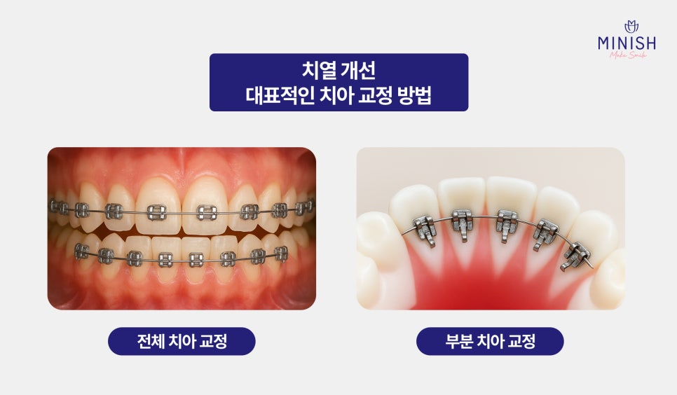 치아 전체의 배열을 전반적으로 개선하는 방법으로, 교정 장치를 부착해 치아를 서서히 이동시킵니다.