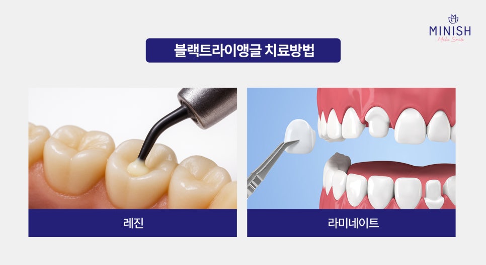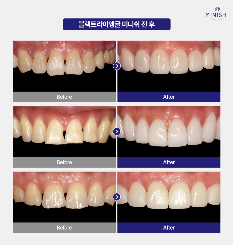블랙트라이앵글은 틈의 크기나 위치에 따라 레진, 라미네이트 등 다양한 방법으로 개선할 수 있습니다. 다만, 각 방법마다 장단점이 명확해, 치료 전 충분한 상담이 필요합니다. 이런 단점을 보완하면서 자연치아를 최대한 보존하고 심미성과 내구성을 동시에 잡은 방법이 ‘미니쉬’입니다.