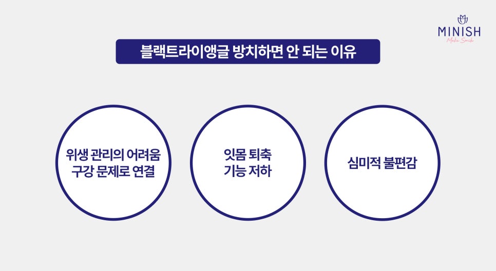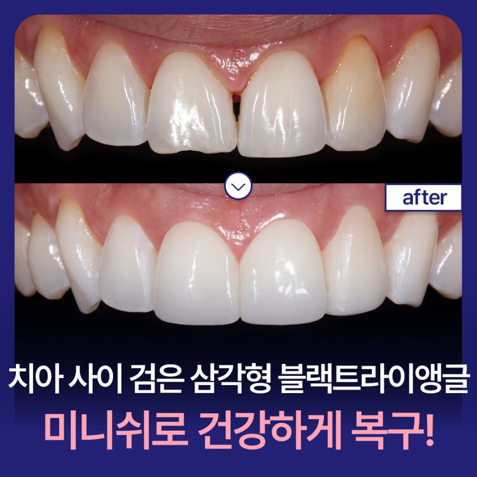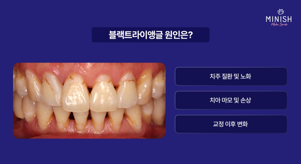 이처럼 블랙트라이앵글은 단순한 미용의 문제가 아니라 구강 건강 전반에 악영향을 줄 수 있는 신호이기 때문에 정확한 원인 분석과 치료가 필요합니다.
