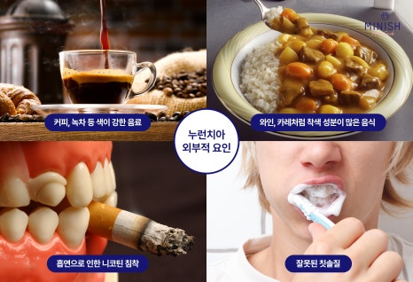- 외부적 요인 – 치아 겉면(법랑질)에 색소가 쌓인 경우