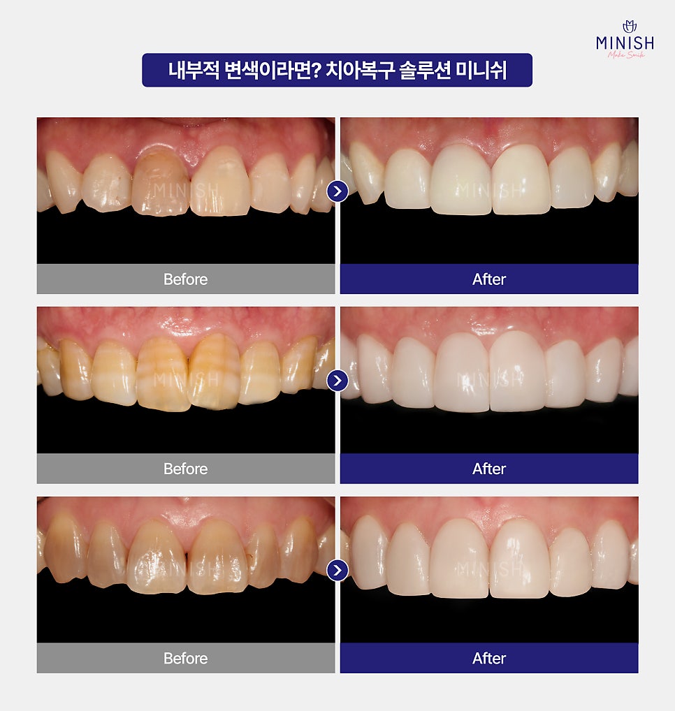 즉, 내부적 변색·법랑질 마모·상아질 노출 등 “원인 자체가 구조적 문제”인 경우에는 미니쉬가 더 근본적인 해결책이 될 수 있습니다.