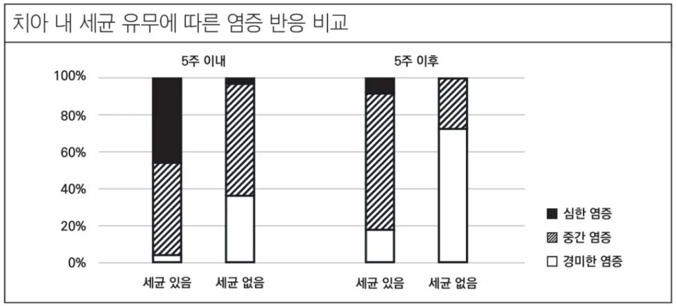 세균이 있는 경우 5주 이후에도 심한 염증(검정)이 지속되지만 세균이 없는 경우는 5주 이후 대부분 경미한 반응(흰색)으로 감소 출처: J Camps, Dent Mater, 2000