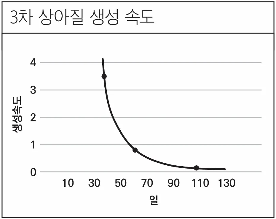 치료 후 30일부터 빠르게 생성되기 시작해 90일 이후에는 생성 속도가 현저히 느려진다. 이는 3개월이 회복의 중요한 기준점임을 보여준다.