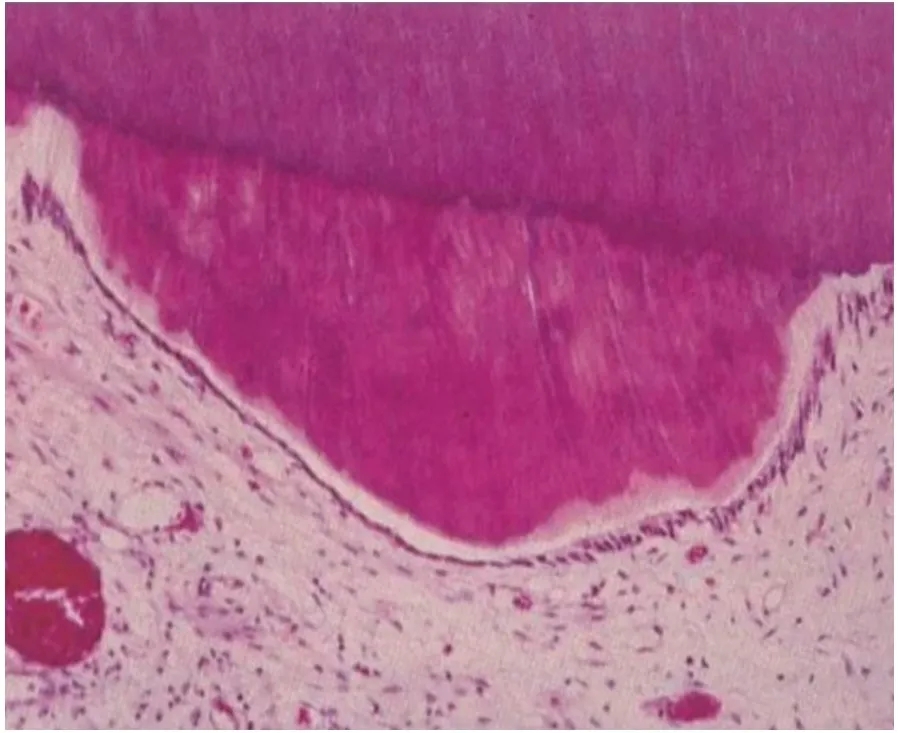 치아가 자극에 반응해 스스로 생성한 3차 상아질(분홍색 부분) 모습. 이 층이 형성되면서 외부 자극이 신경으로 전달되는 것을 차단
