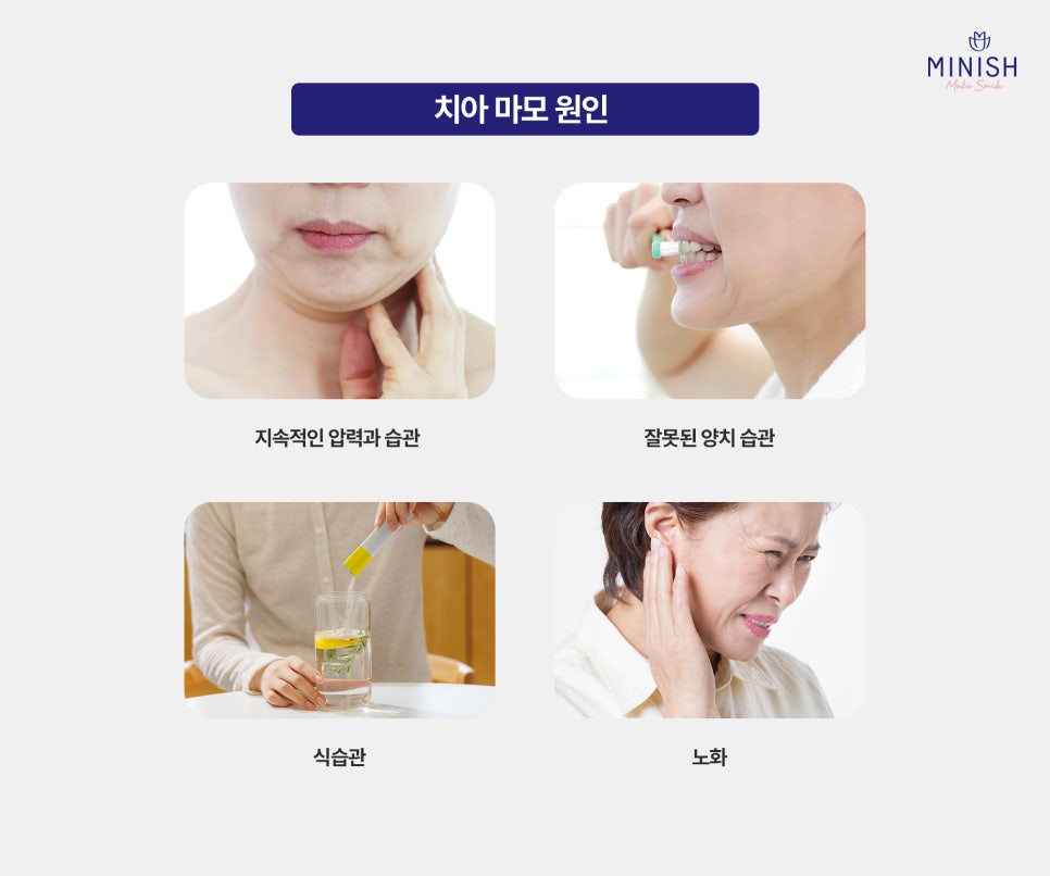 치아가 닳는 데에는 여러 요인이 복합적으로 작용합니다. 대표적인 원인은 아래와 같습니다.