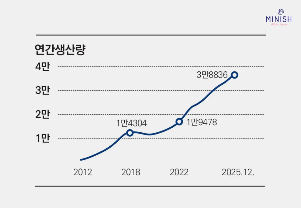 2024년 생산량은 3만 74개를 기록했으며, 2025년에는 연간 4만 개에 근접한 생산 흐름을 보이고 있습니다. 이는 밀링 머신을 50대 규모로 확충하며 생산 역량을 강화한 결과입니다. 외부 협력 확대도 기여했습니다. 과거에는 미니쉬치과병원 내부 제작 비율이 높았으나, 2023년 이후 국내 및 일본 프로바이더 주문이 증가하며 현재는 외부 생산 비율이 전체의 20% 이상을 차지하고 있습니다.