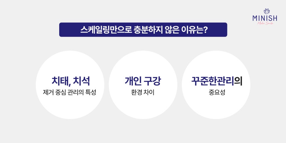 구강 관리는 한 번으로 끝나는 것이 아니라, 꾸준히 이어져야 하는 과정입니다. 스케일링은 구강 관리의 출발점이 될 수 있으며, 이후에는 자신의 구강 상태에 맞는 관리 방법을 함께 병행하는 것이 도움이 됩니다. 정기적인 스케일링과 함께 미니쉬 구강스파를 통해 보다 건강한 구강 환경을 유지해 보시기 바랍니다.
