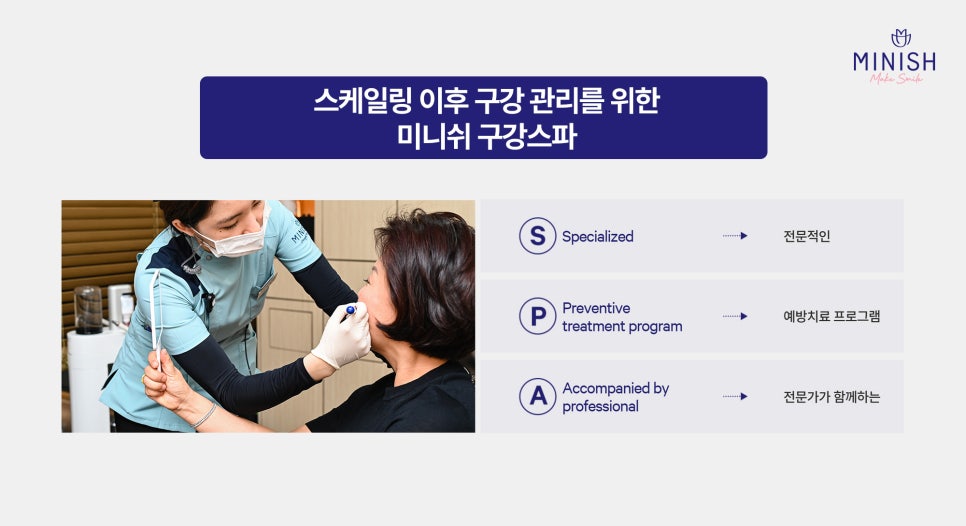 스케일링으로 치아 표면의 치석을 제거했다면, 이후에는 구강 환경 전반을 보다 체계적으로 관리하는 접근도 함께 고려할 수 있습니다. 미니쉬 구강스파는 구강질환의 예방과 관리를 목적으로, 개인의 구강 상태에 맞춘 관리 프로그램을 진행합니다.