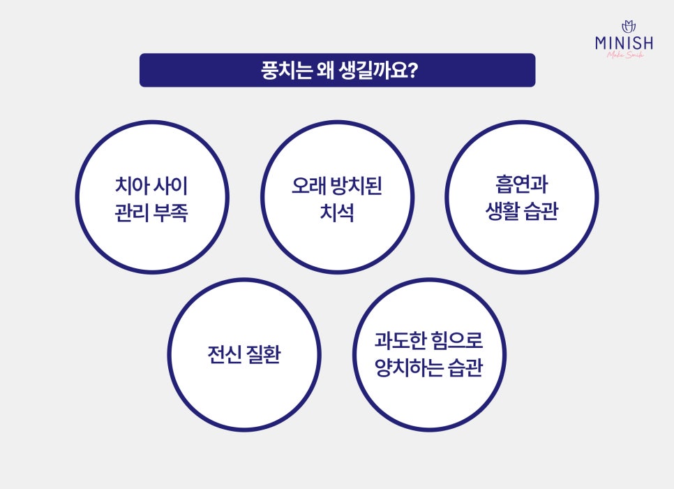 풍치의 가장 큰 원인은 치아와 잇몸 경계에 남아 있는 세균과 치석입니다. 제거되지 못한 세균막이 염증을 일으키고, 이 염증이 반복되면서 잇몸 조직을 손상시킵니다.