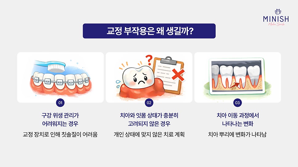 치아교정을 고민하는 분들이 가장 많이 걱정하는 것 중 하나가 바로 교정 부작용입니다. 가지런한 치아를 만들 수 있다는 장점은 잘 알려져 있지만, 치료 과정이나 이후에 문제가 생길까 걱정하는 분들도 적지 않습니다. 실제로 치아교정은 치아 배열과 교합을 개선하는 치료이지만, 개인의 구강 상태나 관리 방법에 따라 예상하...