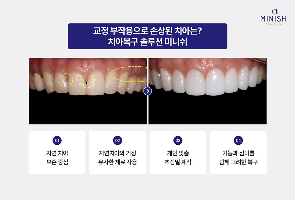 치아교정을 통해 치열이 가지런해지더라도, 경우에 따라 교정 과정에서 나타난 부작용이나 치아 변화가 남아 있을 수 있습니다. 또 교정 후 배열은 개선되었지만 치아의 모양이나 길이, 색상, 치아 사이 공간 등에서 아쉬움이 남는 경우도 있습니다. 이처럼 교정 이후 치아 자체의 손상이나 형태 변화가 남아 있는 경우라면 미니쉬를 통해 개선을 고려해볼 수 있습니다. 미니쉬는 자연치아를 최대한 보존하면서 치아의 기능과 형태를 함께 복구하는 치아복구 솔루션이며 다음과 같은 특징이 있습니다.