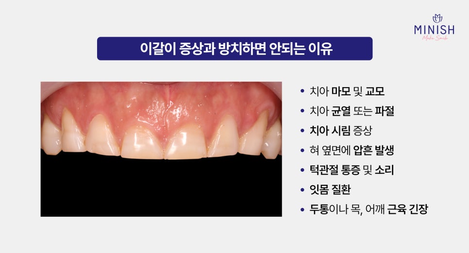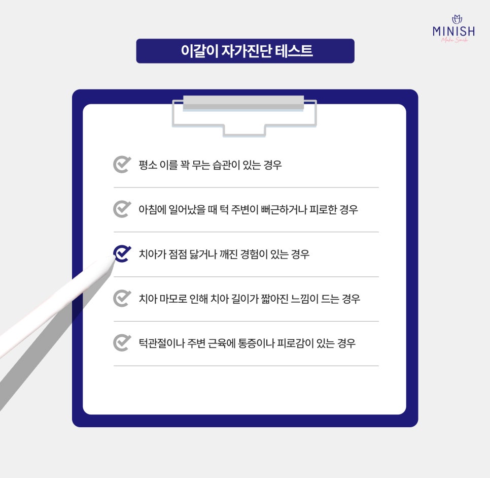 이갈이는 단순한 습관처럼 보일 수 있지만 오래 지속되면 치아 마모, 치아 균열, 턱관절 문제로 이어질 수 있습니다. 특히 반복되는 압력으로 인해 치아가 점점 닳아 길이가 짧아지는 경우도 있습니다.이미 치아 마모가 진행된 상태라면 이갈이 관리와 함께 손상된 치아의 기능과 심미를 복구하는 미니쉬가 정답일 수 있습니다. 이갈이로 인해 치아 마모나 턱 불편감이 느껴진다면 정확한 구강 상태를 확인해 보시는 것이 좋습니다. 자세한 진단이 필요하다면 미니쉬치과병원에 내원해 상담을 받아보시기 바랍니다.