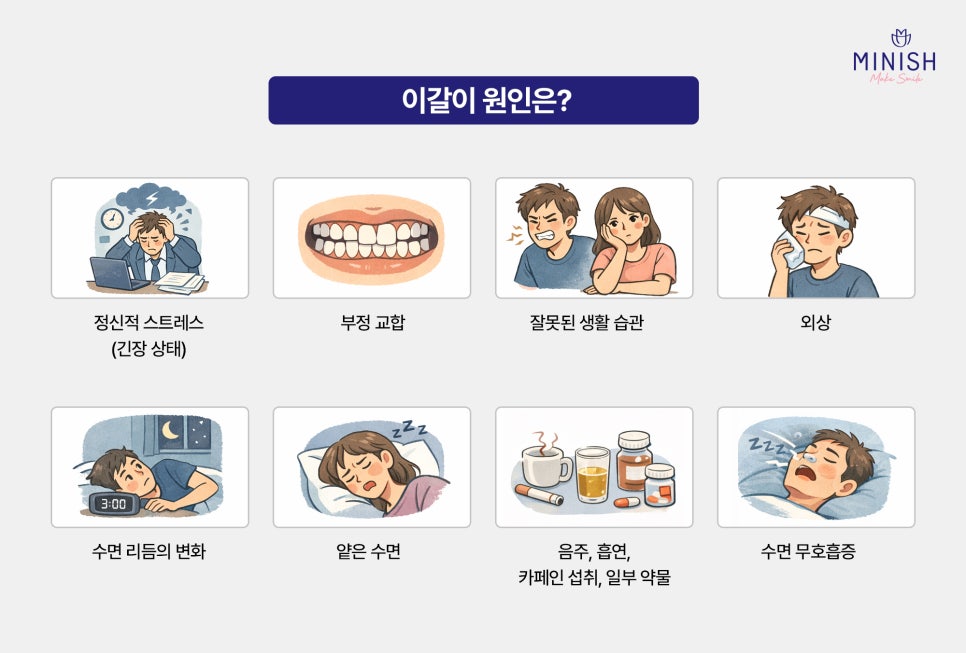 이갈이는 단순히 피곤하거나 스트레스를 받았을 때 나타나는 습관으로 생각하기 쉽지만 실제로는 여러 요인이 복합적으로 작용해 나타날 수 있습니다. 대표적으로는 정신적 스트레스나 긴장 상태, 부정교합, 잘못된 생활 습관, 외상, 수면 리듬의 변화 등이 원인으로 작용할 수 있습니다. 최근에는 수면 중 발생하는 이갈이가 뇌의 중추신경계 활동과 연관된 현상으로 설명되기도 합니다. 잠을 자는 동안 깊은 수면 상태에서 얕은 수면 상태로 전환되는 과정에서 턱 근육이 순간적으로 강하게 수축하면서 치아를 갈게 되는 경우가 있다는 것입니다. 또한 음주, 흡연, 카페인 섭취, 일부 약물, 수면무호흡증과 같은 수면 관련 문제도 이갈이를 악화시키는 요인으로 알려져 있습니다. 이처럼 다양한 요소가 영향을 줄 수 있기 때문에 정확한 원인을 확인하기 위해서는 구강 상태와 생활 습관을 함께 살펴보는 과정이 필요합니다.