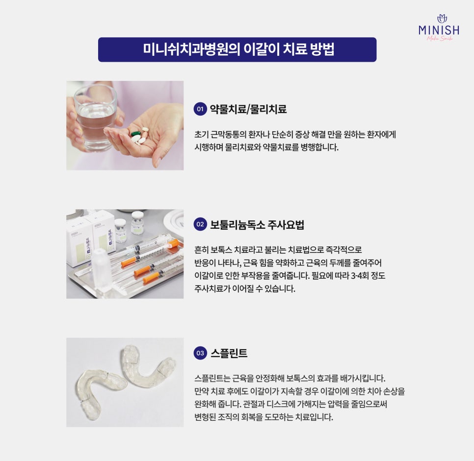 일반적으로 보톡스 치료라고 알려진 방법으로 턱 근육의 힘을 약화시켜 이갈이로 인한 부담을 줄이는 데 도움을 줄 수 있습니다.