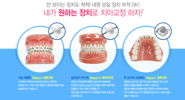 클리피씨 세라믹교정 : 치아색과 비슷한 세라믹 교정장치로, 브라켓과 와이어를 묶지 않아 마찰력이 좋고,